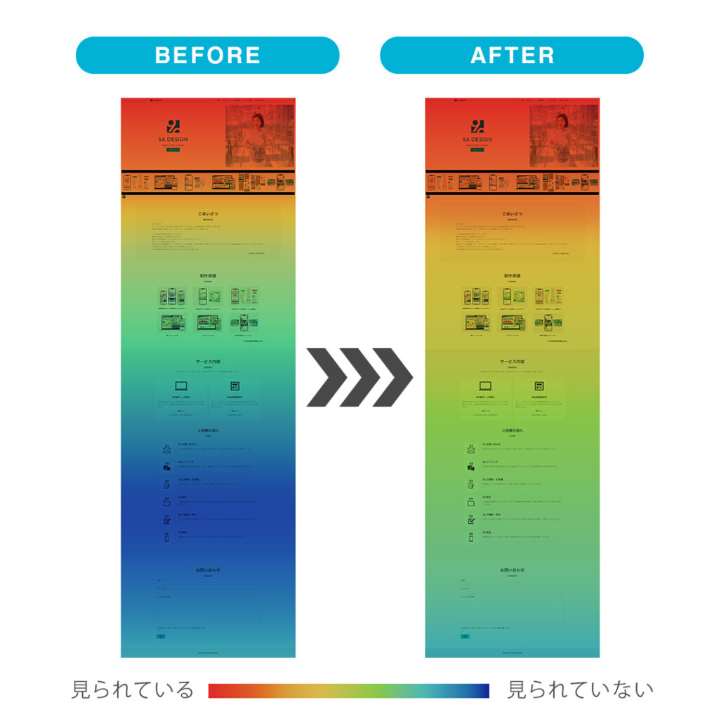 ヒートマップ解析 ANALYSIS Webサイトは「作って終わり」ではありません。実際にユーザーがどの部分に注目し、どこで離脱しているのかを把握することが、成果につながる改善の第一歩です。SA DESIGNではヒートマップ解析士があなたのサイトを可視化し、サイトを一緒に育てていきます。 ヒートマップとは? ヒートマップとは、お客様がホームページ上でどんな行動をしているか を、色の濃淡で視覚的に見える化するツールです。ヒートマップを使うことで、以下のことがわかります。どこでよく読まれているのかどこで離脱しているのかどこがクリックされているのかよく見られている場所は”暖色”、見られていない場所ば”寒色”になります。感覚ではなくデータで改善ポイントを特定できます。ヒートマップを導入することでお客様の “動き・興味・つまずきポイント” がひと目で分かります。 LPまたはHP購入者様限定 1ヶ月分のサポート&解析レポートをプレゼント! お問い合わせ CONTACT お問い合わせは下記のフォームよりお気軽にお待ちしております。 お問い合わせ